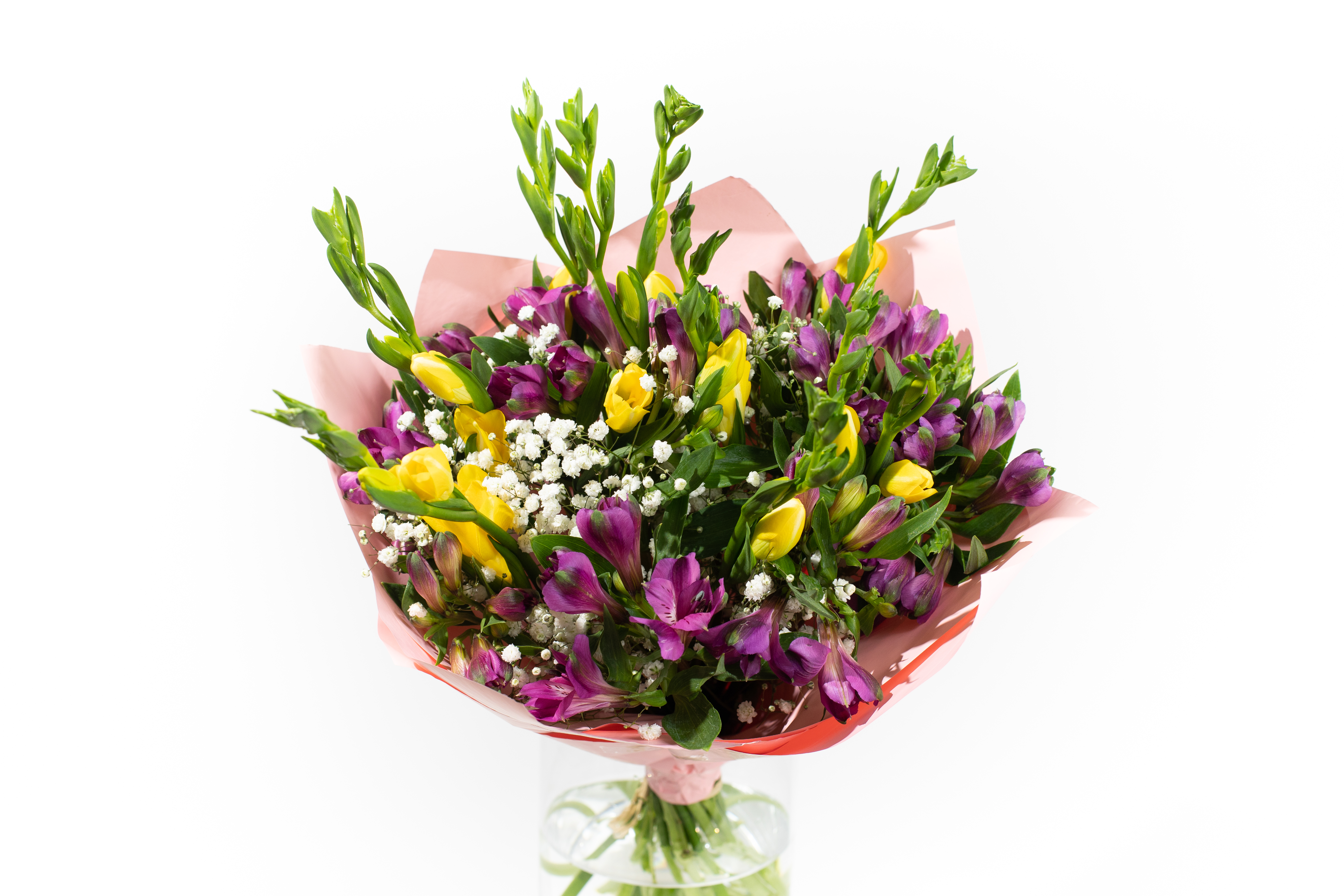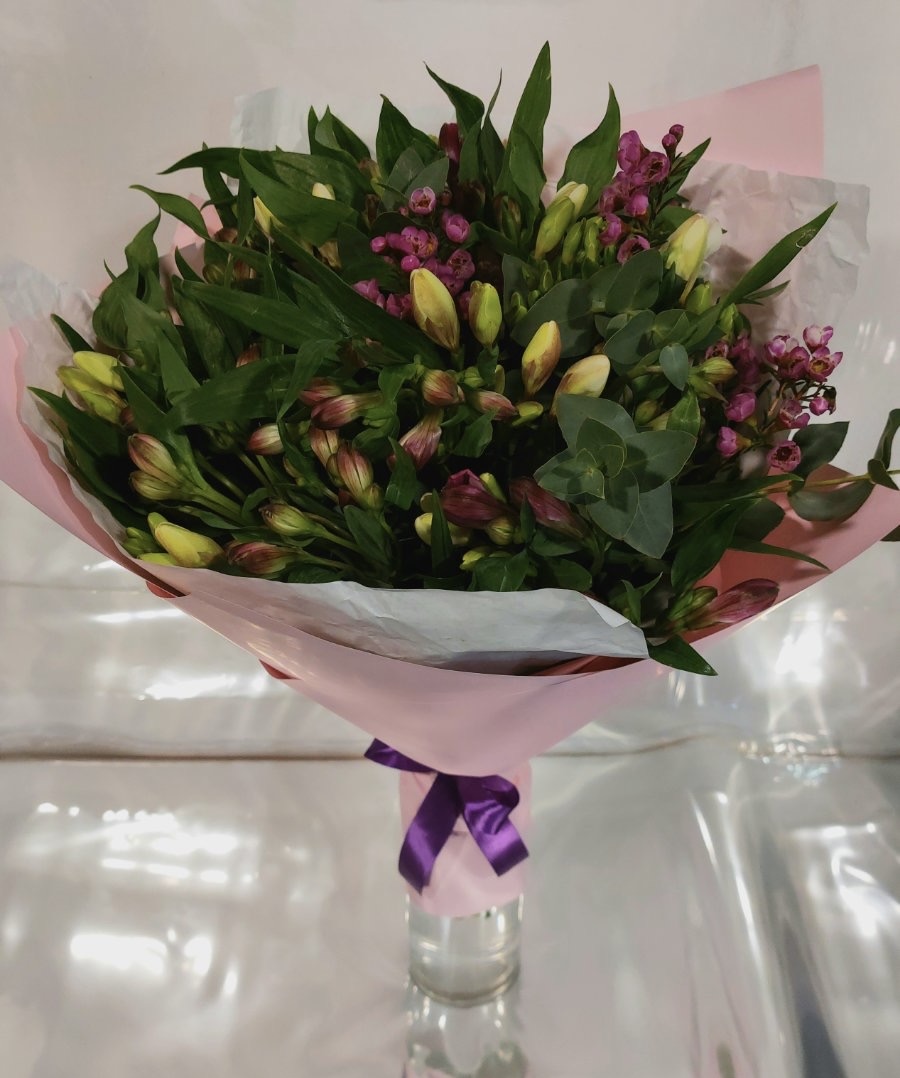 Ši puokštė sudaryta iš alstromerijų, kurios suteikia jaukumo bei jaunatviškumo, o spalvingosios frezijos leidžia pasinerti ir mėgautis gaivia diena vis iš naujo.