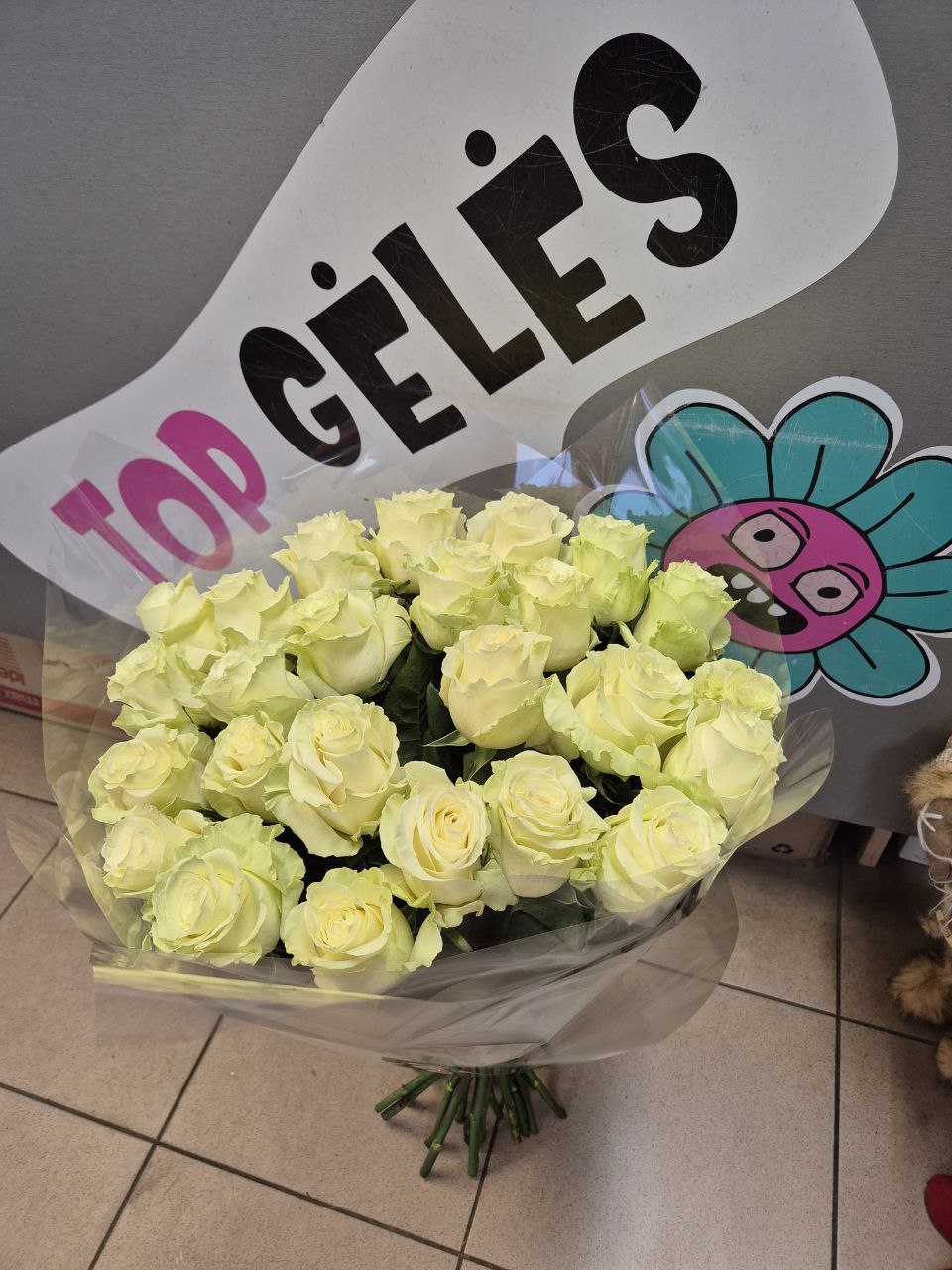 Puokštę sudaro krupščiai supakuota 25 vnt baltų rožių puokštė.