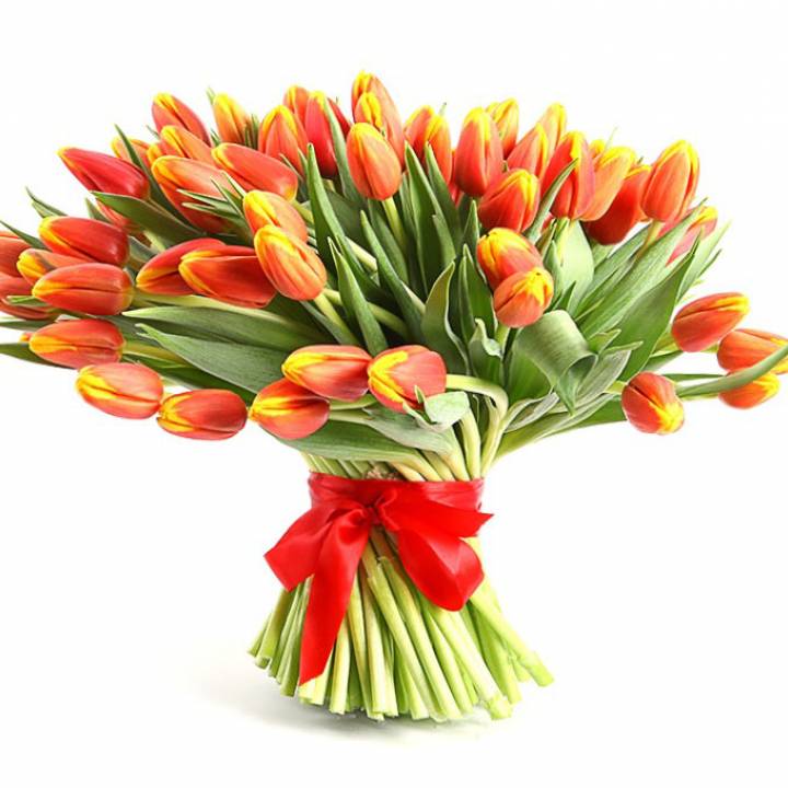 Raudonų tulpių su geltonu krašteliu puokštė 25 vnt, tik 21 eur